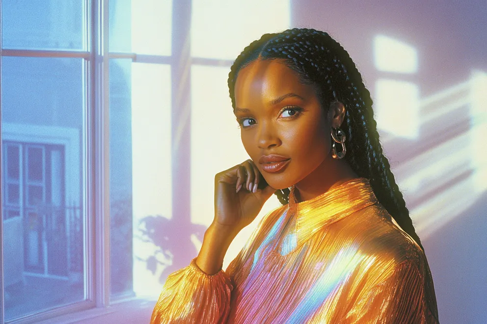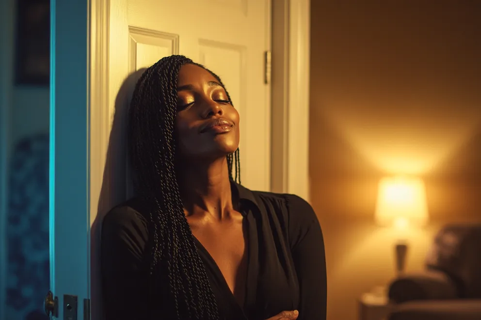 A woman leaning back on a door, looking peaceful and smiling | Source: Midjourney