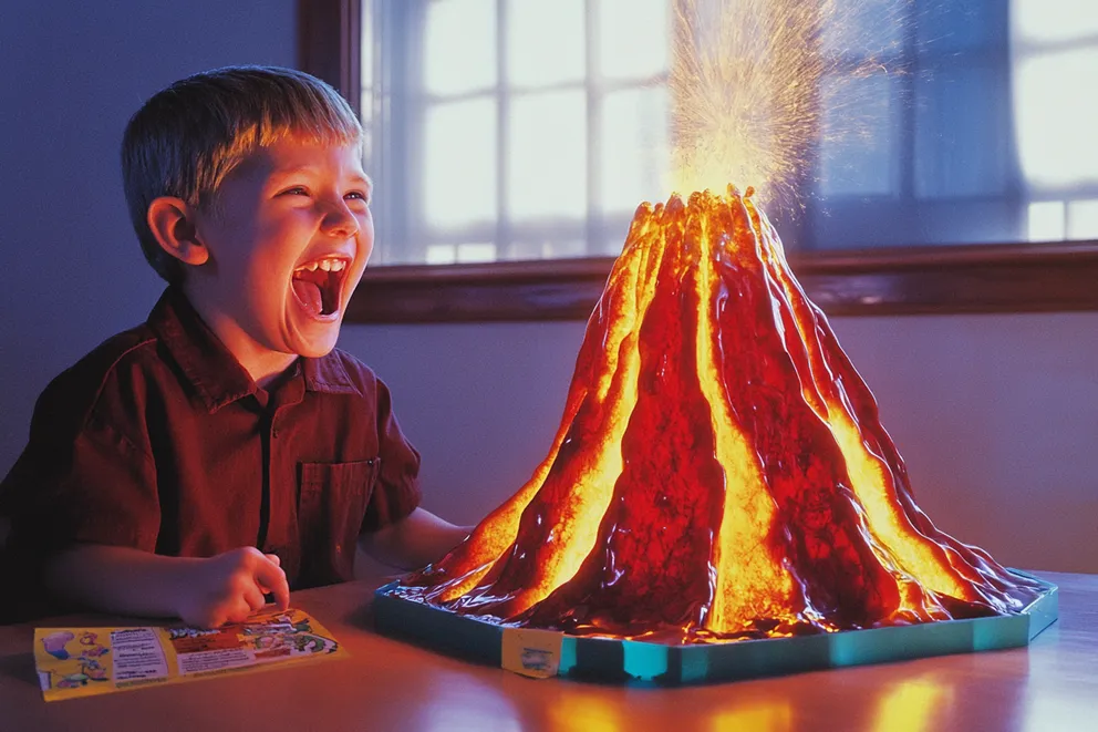 A kid laughing as a science project volcano erupts on a table in the living room | Source: Midjourney