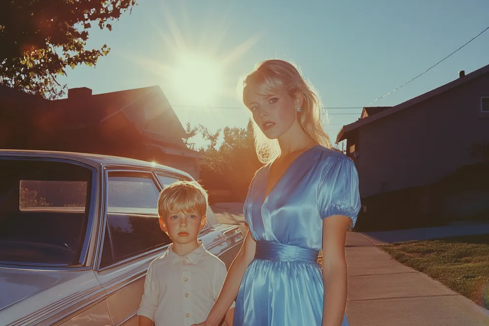 A woman standing next to a small boy in front of a car in a suburban neighborhood | Source: Midjourney
