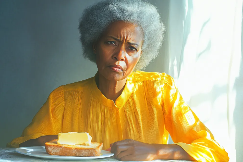 An older woman sitting at a table with toast on her plate, frowning | Source: Midjourney