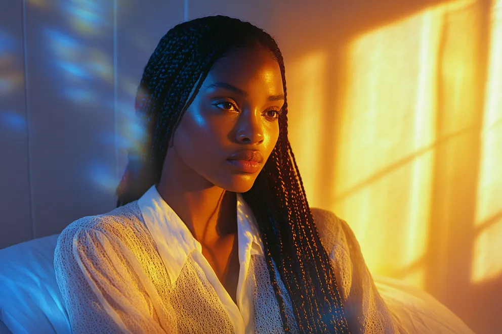 A woman sitting in bed at night looking thoughtful | Source: Midjourney