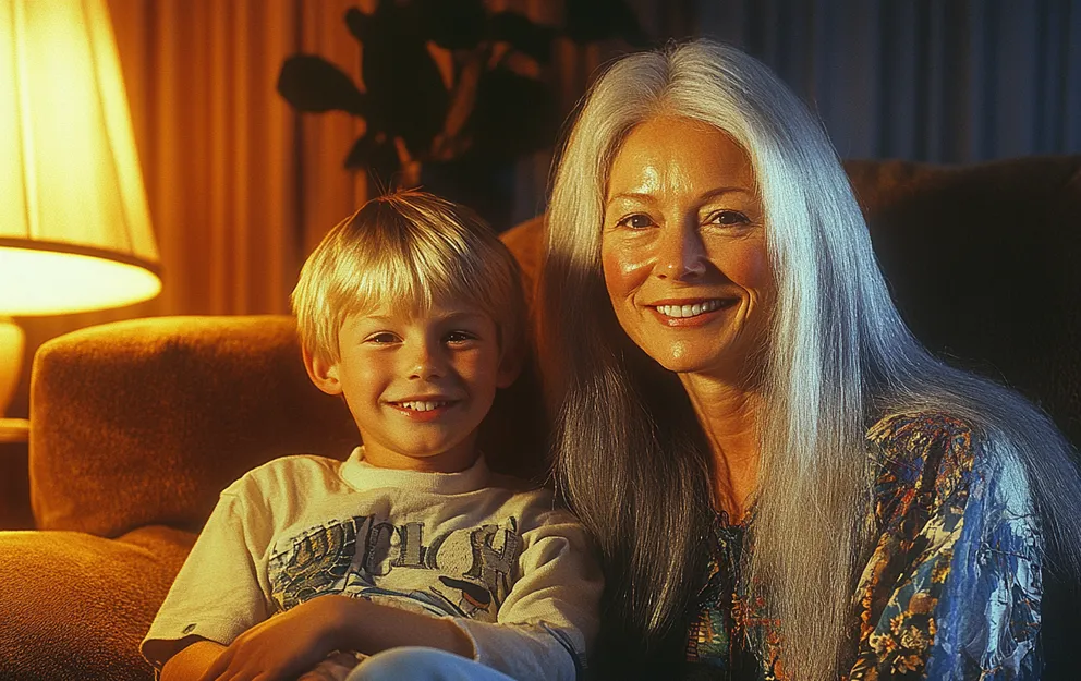 An older woman and her grandson sitting on a couch, smiling | Source: Midjourney