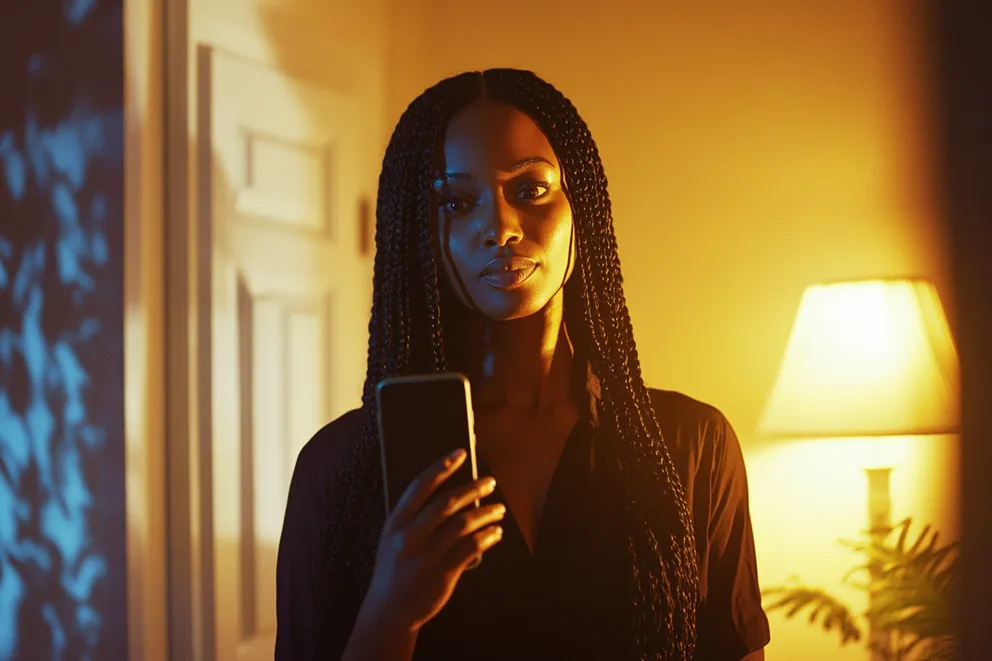 A woman holding up a phone in a living room at night | Source: Midjourney