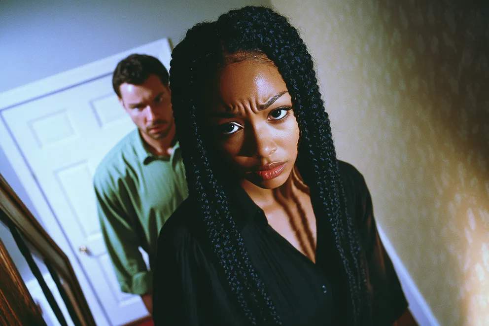 A woman going up the stairs in a house with a man following behind her, looking sad | Source: Midjourney