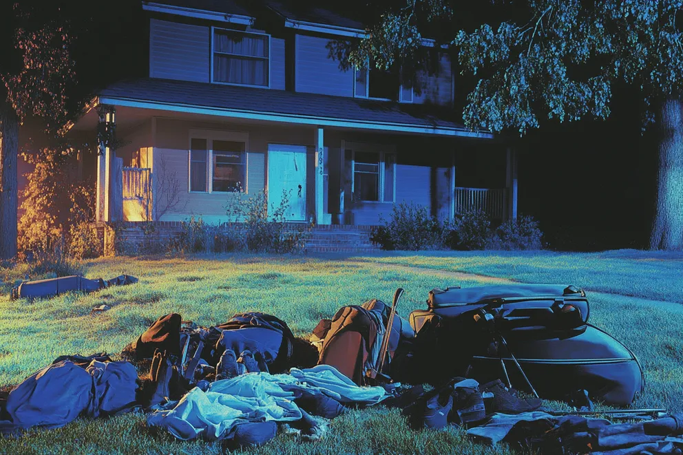 Clothes and other belongings scattered on the front lawn of a house at night | Source: Midjourney