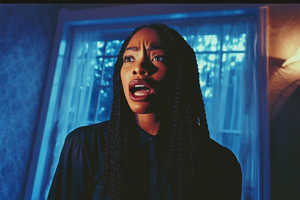 A woman yelling in a bedroom in front of a window at night | Source: Midjourney