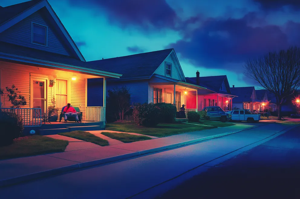 People on their porches in a suburban neighborhood at night | Source: Midjourney