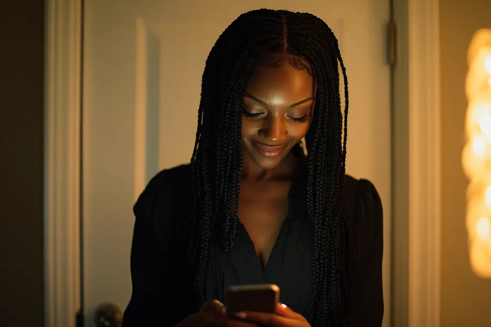 A woman in a living room, smiling while texting | Source: Midjourney