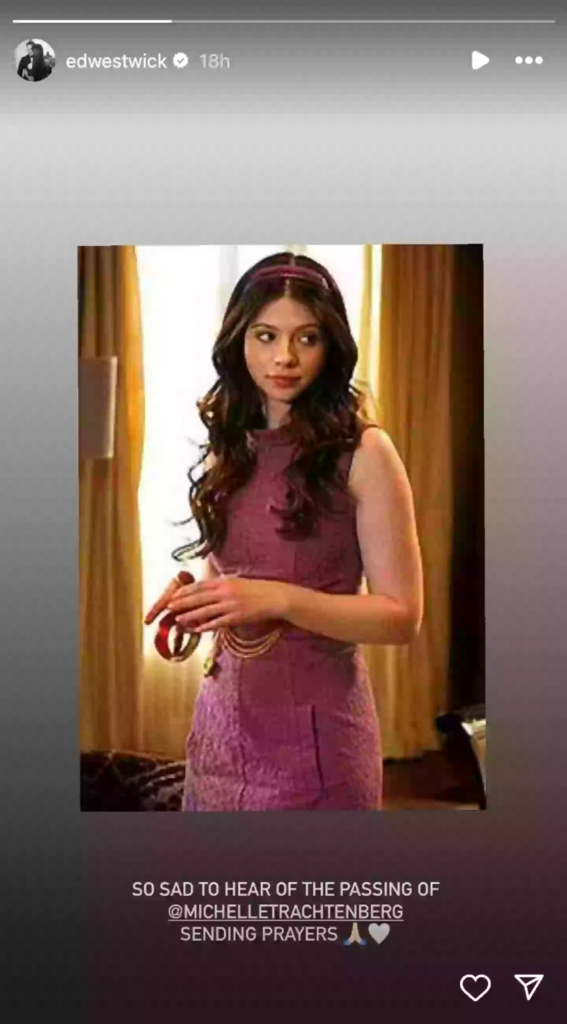 Sharing a photo to his Story of the late actress as her Gossip Girl character Georgina Sparks, he wrote: “So sad to hear of the passing of @michelletrachtenberg.”