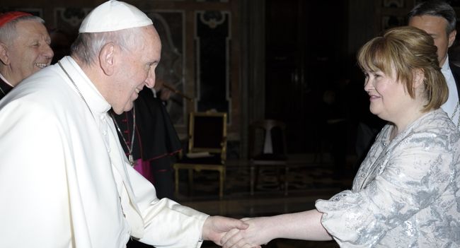The ‘Britain’s Got Talent’ winner and a devout Catholic, was invited to sing at the annual Christmas Concert on Saturday night. For Susan this wasn’t just another performance. This was an honor and a humbling experience. Before taking over the stage she got to meet the Pope Francis himself. Glowing with a smile and beaming with joy she shook his hands, savoring this unforgettable moment.