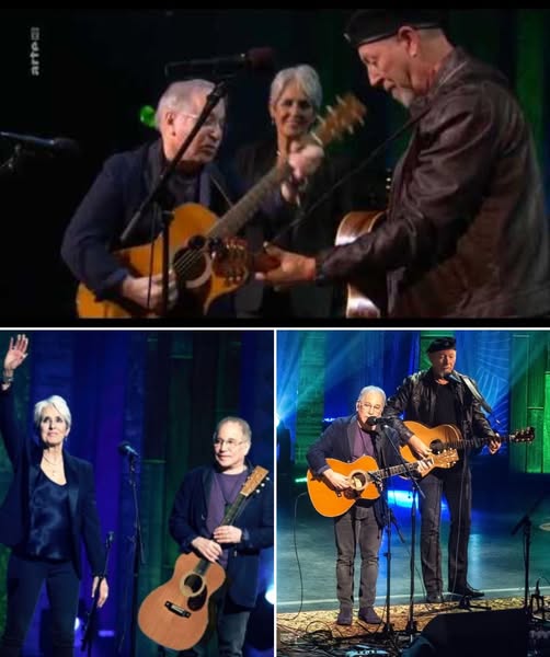 Paul Simon (aged 73 during this performance) joined Joan Baez on stage for a live rendition of Simon & Garfunkel’s 1969 folk hit, “The Boxer,” taken from their final, chart-topping studio album, “Bridge Over Troubled Water.” Paul played guitar and dueted on vocals with Joan, backed by a second guitarist, Richard Thompson (66), a London-born legend of the folk scene.