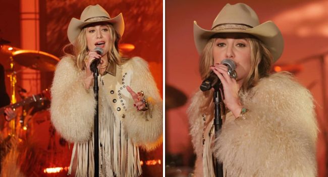 Set against a warm, inviting backdrop, the performance reflected Wilson’s roots from her hometown of Baskin, Louisiana. She looked stunning in a bone-colored fringe jacket with feathered sleeves, paired with her signature gold bell bottoms and a tan cowboy hat. The heartfelt tune echoed her deep connection to the Western lifestyle and her family’s farming heritage.