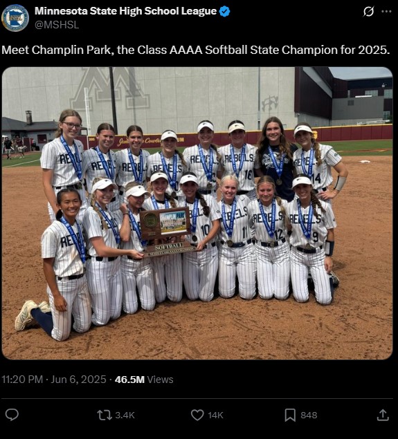 It all started with what was supposed to be a celebration. The Minnesota State High School League posted a proud photo of Champlin Park’s softball team after they won the Class AAAA State Championship.