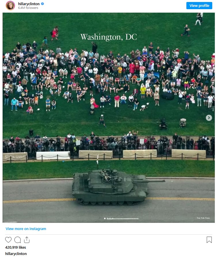 Hillary Clinton couldn’t resist commenting on the stark contrast. In a now-viral Instagram post, she shared side-by-side photos of Trump’s parade and the nationwide protests with a simple caption urging her followers to “compare and contrast scenes from yesterday in America.”