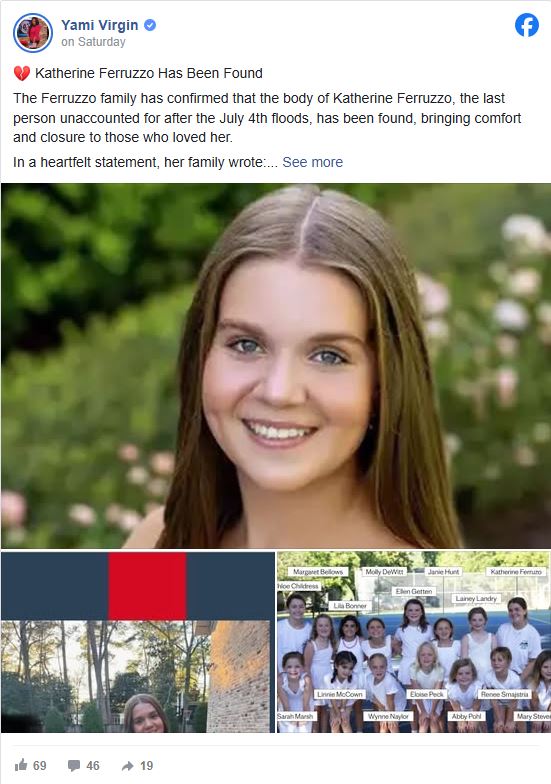 Camp co-owner Richard Eastland, 70, also died trying to rescue campers. Ferruzzo and Eastland were among at least 87 victims in Kerr County, the hardest-hit area. In response, the Ferruzzo family has created a foundation in Katherine’s honor.