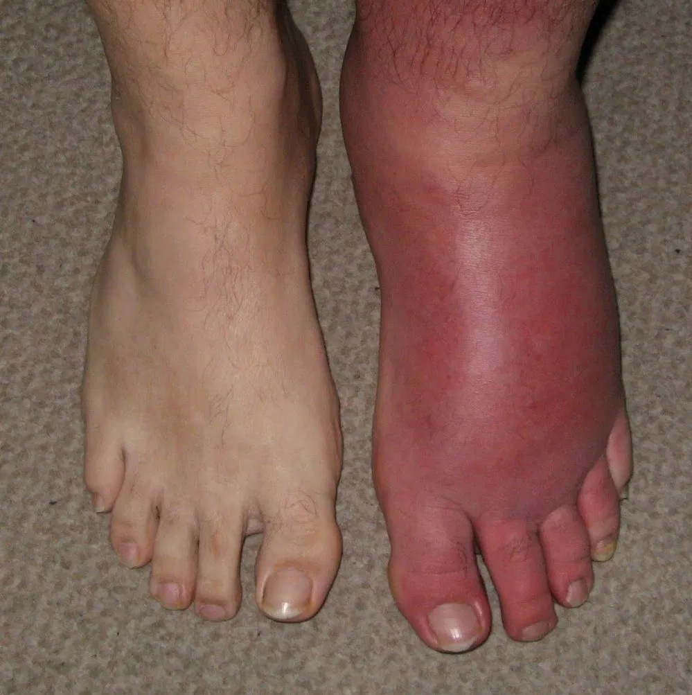 Gout or arthritis, where uric acid crystals or inflammation cause pain and swelling in the joints.