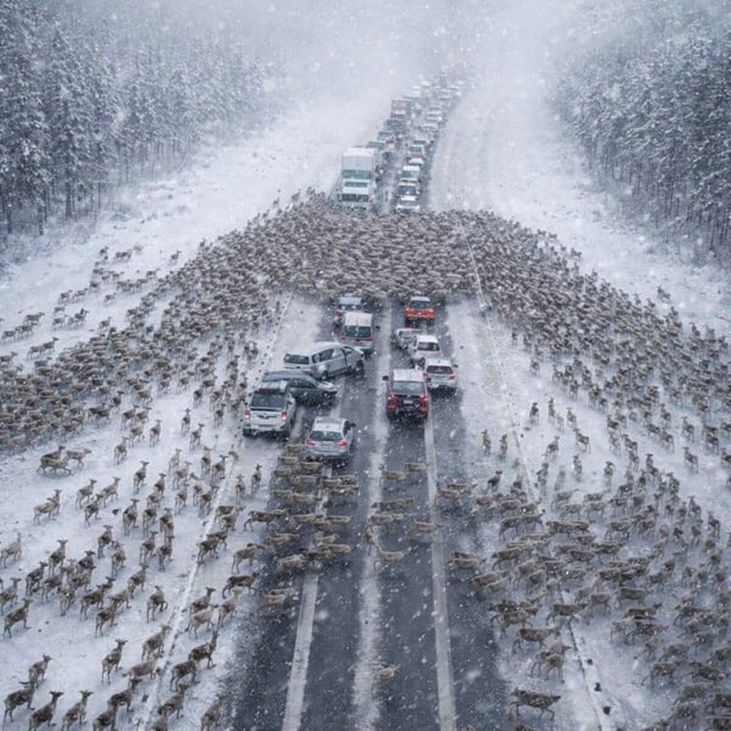As traffic slowed through a mountain pass, movement appeared at the forest’s edge. A single deer stepped onto the road, followed by another, then many more. Cars gradually stopped. People watched in silence as dozens of deer crossed, their breath visible in the cold air. At first, it felt magical—like a scene from a storybook.